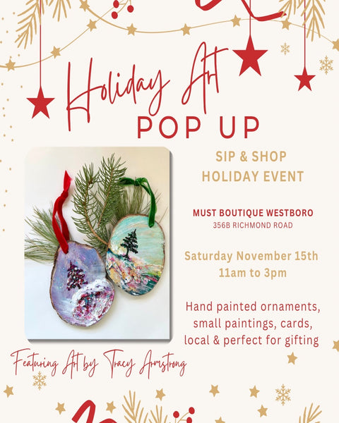 A Christmas Art Popup at Must Boutique Westboro, 356B Richmond Road. A festive party is planned to pick out your one of a kind Christmas ornaments in person, how fun! Small art and cards will also be available for purchase. It's a Sip and Shop event.