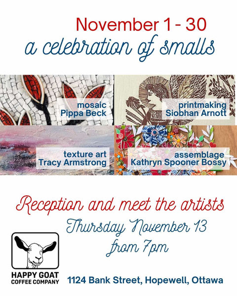 A Celebration of Smalls at Happy Goat Cafe on 1124 Bank Street (Hopewell). Four artists created some delicious smalls for your walls for the month of November. Drop into the cafe during the month of November to celebrate life and art.